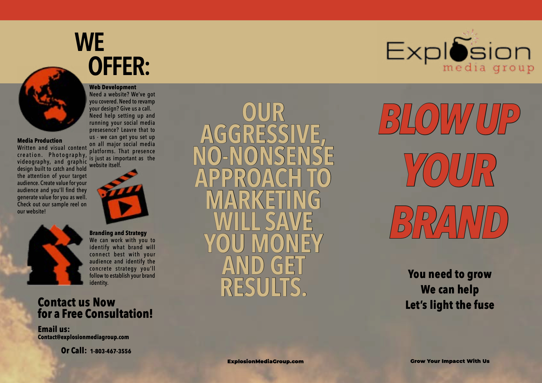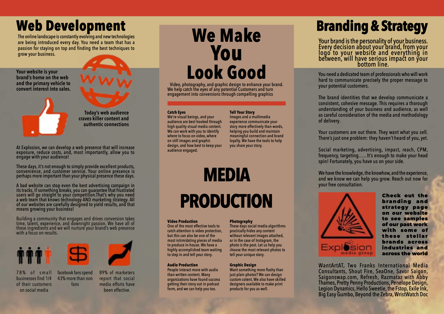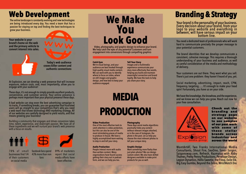The final piece is a sales brochure I created for a marketing firm called Explosion Media Group. This piece was created using Adobe InDesign.